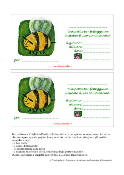 Filastrocche.it vi regala l’originale biglietto di invito per la Festa di Compleanno con un’allegra ape. Stampate il file su un cartoncino, per farlo durare più a lungo, ritagliate gli inviti e compilateli con il vostro nome, il nome dell’invitato e le informazioni su dove e quando si svolgerà la festa. Gli inviti sono pronti per essere consegnati! Buon Compleanno!