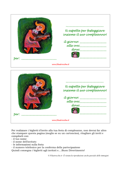 Filastrocche.it vi regala l’originale biglietto di invito per la Festa di Compleanno con la ragazza che suona la chitarra. Stampate il file su un cartoncino, per farlo durare più a lungo, ritagliate gli inviti e compilateli con il vostro nome, il nome dell’invitato e le informazioni su dove e quando si svolgerà la festa. Gli inviti sono pronti per essere consegnati! Buon Compleanno!