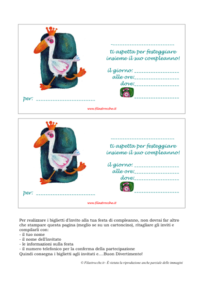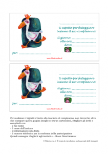 Filastrocche.it vi regala l’originale biglietto di invito per la Festa di Compleanno con una simpatica ochetta. Stampate il file su un cartoncino, per farlo durare più a lungo, ritagliate gli inviti e compilateli con il vostro nome, il nome dell’invitato e le informazioni su dove e quando si svolgerà la festa. Gli inviti sono pronti per essere consegnati! Buon Compleanno!