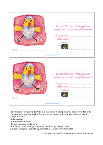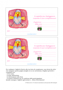 Filastrocche.it vi regala l’originale biglietto di invito per la Festa di Compleanno con un tenero pulcino rosa. Stampate il file su un cartoncino, per farlo durare più a lungo, ritagliate gli inviti e compilateli con il vostro nome, il nome dell’invitato e le informazioni su dove e quando si svolgerà la festa. Gli inviti sono pronti per essere consegnati! Buon Compleanno!