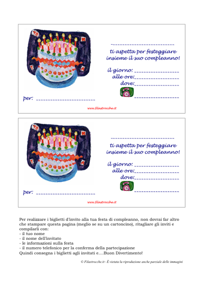 Filastrocche.it vi regala l’originale biglietto di invito per la Festa di Compleanno con una torta golosa e invitante. Stampate il file su un cartoncino, per farlo durare più a lungo, ritagliate gli inviti e compilateli con il vostro nome, il nome dell’invitato e le informazioni su dove e quando si svolgerà la festa. Gli inviti sono pronti per essere consegnati! Buon Compleanno!