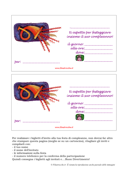 Filastrocche.it vi regala l’originale biglietto di invito per la Festa di Compleanno con un’allegra  trombetta. Stampate il file su un cartoncino, per farlo durare più a lungo, ritagliate gli inviti e compilateli con il vostro nome, il nome dell’invitato e le informazioni su dove e quando si svolgerà la festa. Gli inviti sono pronti per essere consegnati! Buon Compleanno!