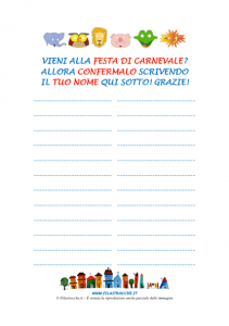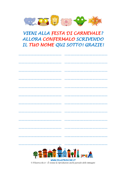 Per un’organizzazione più semplice ed efficace della vostra festa di Carnevale, Filastrocche.it vi regala il foglio delle conferme. Stampatelo e appendetelo sotto uno degli inviti che vi proponiamo. Ogni invitato potrà scriverci il proprio nome, se intende partecipare alla festa: così saprete in un attimo il numero dei partecipanti! Buon divertimento!