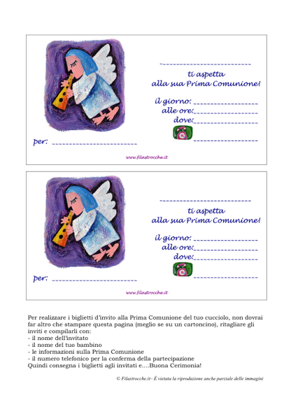 Filastrocche.it vi regala l’originale biglietto di invito per la Prima Comunione dei vostri bambini. Stampate il file su un cartoncino, per farlo durare più a lungo, ritagliate gli inviti e compilateli con il nome del festeggiato, il nome dell’invitato e le informazioni su dove e quando si svolgerà la cerimonia. Gli inviti sono pronti per essere consegnati! Tanti auguri!