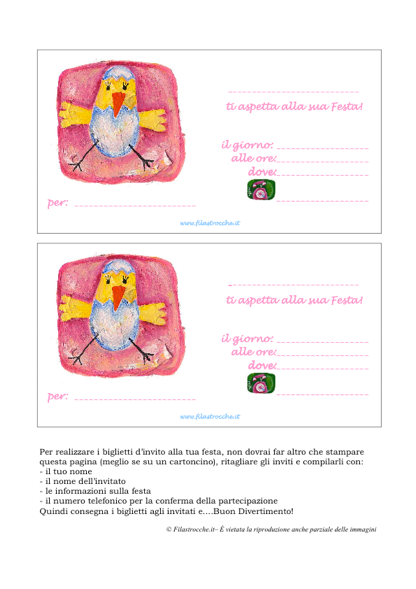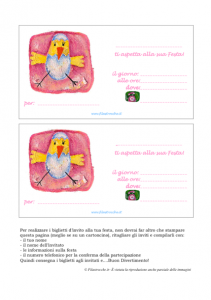 Filastrocche.it vi regala l’originale biglietto di invito per le tue Feste con un tenero pulcino rosa. Stampate il file su un cartoncino, per farlo durare più a lungo, ritagliate gli inviti e compilateli con il vostro nome, il nome dell’invitato e le informazioni su dove e quando si svolgerà la festa. Gli inviti sono pronti per essere consegnati! Buon Divertimento!