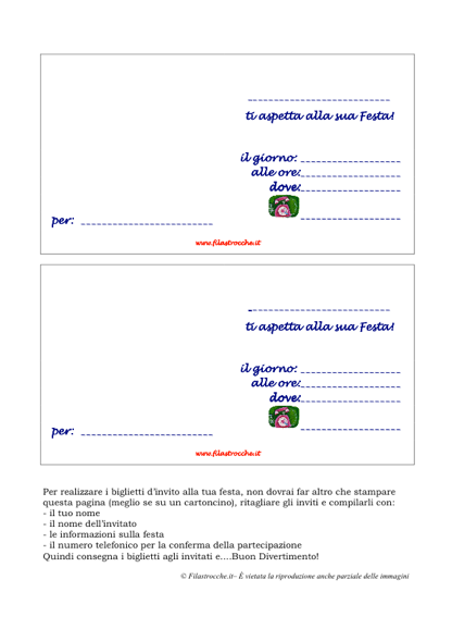 Scatena la tua fantasia e decora il tuo biglietto di invito per la tua festa! Stampalo fai un bel disegno nello spazio a sinistra, poi compilalo e consegnalo agli invitati. Buona Festa da Filastrocche.it!