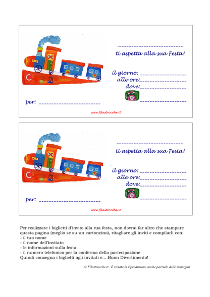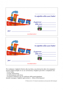 Filastrocche.it vi regala l’originale biglietto di invito per le tue Feste con un colorato trenino. Stampate il file su un cartoncino, per farlo durare più a lungo, ritagliate gli inviti e compilateli con il vostro nome, il nome dell’invitato e le informazioni su dove e quando si svolgerà la festa. Gli inviti sono pronti per essere consegnati! Buon Divertimento!