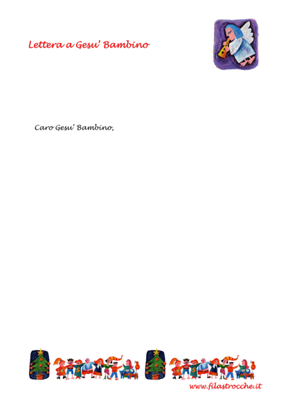 Stampa e scrivi la tua letterina per Gesù Bambino! Se vuoi crea anche la busta, fra quelle che Filastrocche.it ti propone, e “imbucala” tra i rami del tuo Albero di Natale: qualche angioletto verrà a prenderla e la consegnerà al destinatario! E poi cerca di essere buono… Buon Natale!