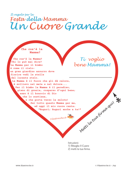 Ecco un simpatico regalino per fare gli auguri alla tua mamma nel giorno della sua Festa! Un cuore grande con l’originale poesia di Filastrocche.it per dirle “Ti voglio bene”! Stampa il file su un cartoncino, firmalo, se vuoi coloralo a piacere, ritaglialo ed ecco è pronto per essere regalato. Auguri Mamma!!