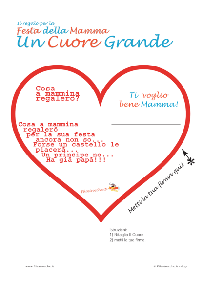Ecco un simpatico regalino per fare gli auguri alla tua mamma nel giorno della sua Festa! Un cuore grande con l’originale filastrocca di Filastrocche.it per dirle “Ti voglio bene”! Stampa il file su un cartoncino, firmalo, se vuoi coloralo a piacere, ritaglialo ed ecco è pronto per essere regalato. Auguri Mamma!!