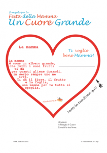Ecco un simpatico regalino per fare gli auguri alla tua mamma nel giorno della sua Festa! Un cuore grande con l’originale poesia di Filastrocche.it per dirle “Ti voglio bene”! Stampa il file su un cartoncino, firmalo, se vuoi coloralo a piacere, ritaglialo ed ecco è pronto per essere regalato. Auguri Mamma!!