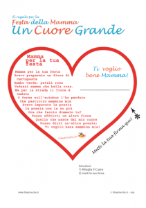 Ecco un simpatico regalino per fare gli auguri alla tua mamma nel giorno della sua Festa! Un cuore grande con l’originale filastrocca di Filastrocche.it per dirle “Ti voglio bene”! Stampa il file su un cartoncino, firmalo, se vuoi coloralo a piacere, ritaglialo ed ecco è pronto per essere regalato. Auguri Mamma!!