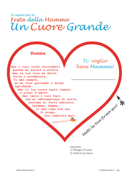 Ecco un simpatico regalino per fare gli auguri alla tua mamma nel giorno della sua Festa! Un cuore grande con l’originale poesia di Filastrocche.it per dirle “Ti voglio bene”! Stampa il file su un cartoncino, firmalo, se vuoi coloralo a piacere, ritaglialo ed ecco è pronto per essere regalato. Auguri Mamma!!