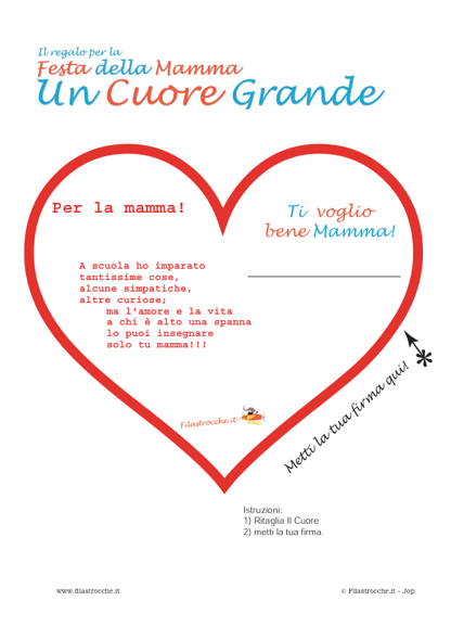 Ecco un simpatico regalino per fare gli auguri alla tua mamma nel giorno della sua Festa! Un cuore grande con l’originale filastrocca di Filastrocche.it per dirle “Ti voglio bene”! Stampa il file su un cartoncino, firmalo, se vuoi coloralo a piacere, ritaglialo ed ecco è pronto per essere regalato. Auguri Mamma!!