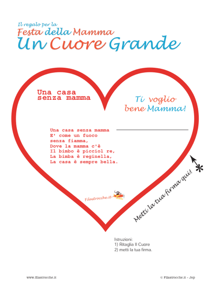 Ecco un simpatico regalino per fare gli auguri alla tua mamma nel giorno della sua Festa! Un cuore grande con l’originale poesia di Filastrocche.it per dirle “Ti voglio bene”! Stampa il file su un cartoncino, firmalo, se vuoi coloralo a piacere, ritaglialo ed ecco è pronto per essere regalato. Auguri Mamma!!