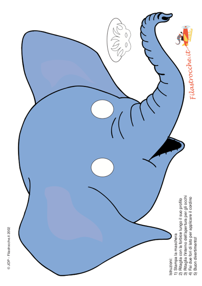 Ecco una bellissima maschera da elefante! Stampala su un cartoncino bianco, ritagliala lungo il contorno, fai due buchi per gli occhi e applica un cordino o un elastico sul retro. Buon Carnevale da Filastrocche.it!!