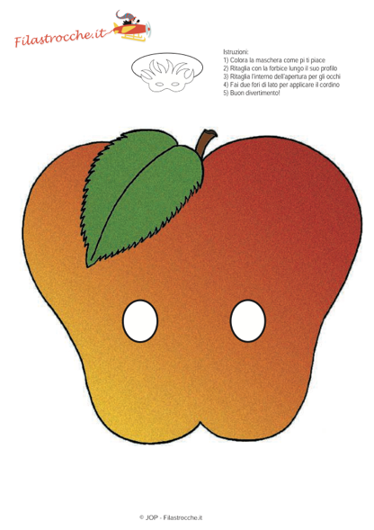 Ecco una bellissima maschera da mela! Stampala su un cartoncino bianco, ritagliala lungo il contorno, fai due buchi per gli occhi e applica un cordino o un elastico sul retro. Buon Carnevale da Filastrocche.it!!
