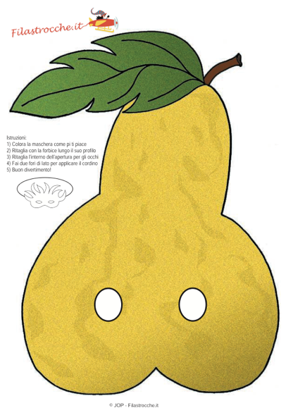 Ecco una bellissima maschera da pera! Stampala su un cartoncino bianco, ritagliala lungo il contorno, fai due buchi per gli occhi e applica un cordino o un elastico sul retro. Buon Carnevale da Filastrocche.it!!