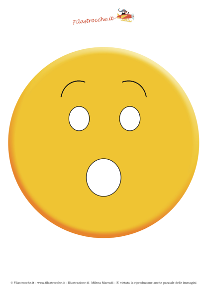 Se vi piacciono gli Emoticon (o Faccine o Smiley) usati in internet o nei SMS, ecco per voi un’originale maschera da Emoticon stupito, che potrete stampare su un cartoncino bianco. Ritagliatela lungo il contorno, fate due buchi per gli occhi e applicate un cordino o un elastico sul retro. Se preferite attaccate la maschera su un bastoncino che vi servirà per posizionarla davanti al viso. Buon Carnevale da Filastrocche.it!!