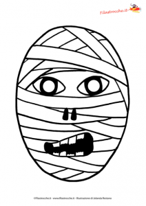 Volete essere spaventosi nella notte di Halloween? Ecco per voi da Filastrocche.it una terrificante maschera da Mummia che potrete colorare come preferite. Stampatela su un cartoncino bianco, ritagliatela lungo il contorno, fate due buchi per gli occhi e altri due fori più piccoli per le narici, applicate un cordino o un elastico sul retro. Buon divertimento!!