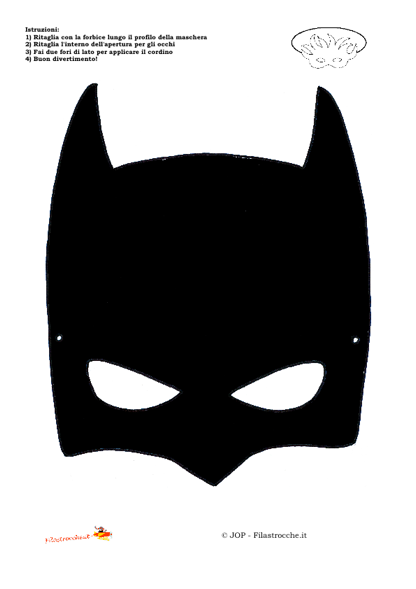 Da Filastrocche.it ecco la maschera di Batman, del vostro Supereroe! Stampatelo su un cartoncino bianco, ritagliatelo lungo i bordi, fate due buchi per gli occhi e applicate un cordino o un elastico sul retro. Buon Carnevale!