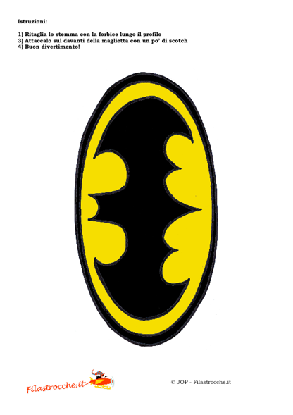 Da Filastrocche.it ecco lo stemma di Batman, del vostro Supereroe! Stampatelo su un cartoncino bianco, ritagliatelo e applicatelo al vostro costume di Batman, con l’aiuto di un po’ di scotch. Buon Carnevale!