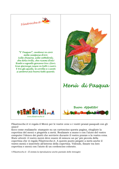 Per il pranzo o la cena di Pasqua, ecco il menù di Filastrocche.it con l’uovo pasquale! Stampatelo su un cartoncino e ritagliatelo: è pronto per essere posizionato sulla vostra tavola! Tanti auguri di Buona Pasqua!