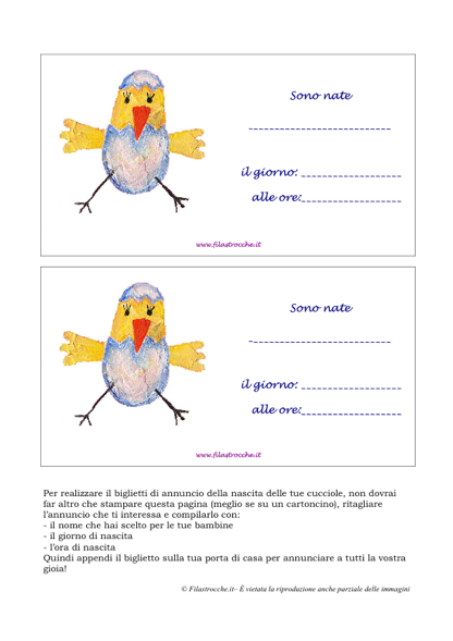Da Filastrocche.it ecco un simpatico annuncio di nascita per le vostre cucciole! Stampate, compilate e inviate ad amici e parenti. Felicitazioni!