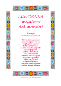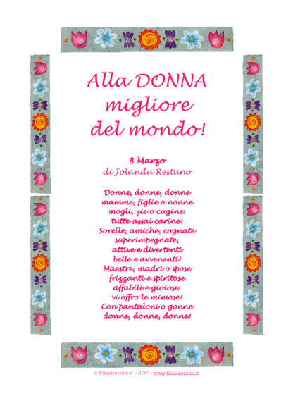Vuoi fare un regalo carino a una Donna speciale nel giorno della sua Festa, l’8 Marzo? Regala l’originale “Poesia in Cornice” di Filastrocche.it. Stampala, arrotolala e fissala con un nastrino colorato. Tanti auguri!