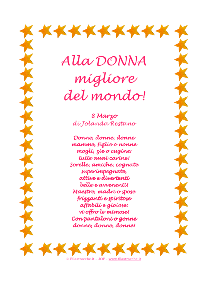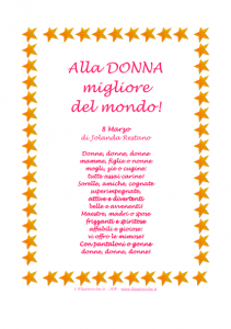 Vuoi fare un regalo carino a una Donna speciale nel giorno della sua Festa, l’8 Marzo? Regala l’originale “Poesia in Cornice” di Filastrocche.it. Stampala, arrotolala e fissala con un nastrino colorato. Tanti auguri!