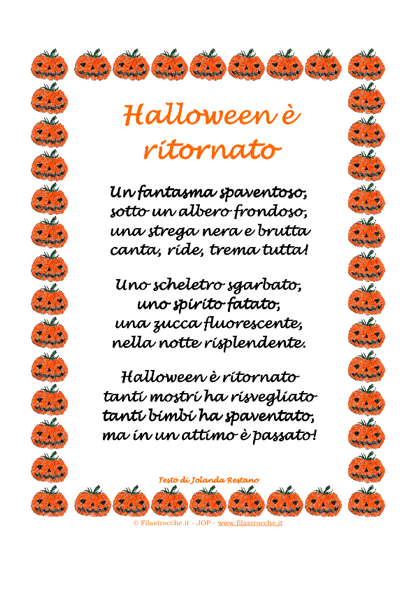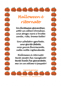 Da Filastrocche.it ecco un’idea da usare come decorazione o come regalo in occasione di Halloween. Stampa su un cartoncino la Poesia in Cornice “Halloween è ritornato”, arrotolala, fermala con un cordoncino arancione e regalala come simpatico ricordo della notte più tenebrosa dell’anno; oppure appendila ai muri o alle porte per decorare la tua casa. Buon Halloween!!