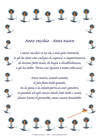 Da Filastrocche.it ecco una nuova idea da usare come decorazione o come regalo in occasione di Natale. Stampa su un cartoncino la Poesia in Cornice “Anno vecchio, anno nuovo”, arrotolala, fermala con un cordoncino rosso o verde e regalala come simpatico ricordo della Festa più bella dell’anno; oppure appendila ai muri o alle porte per decorare la tua casa, o ancora usala per abbellire la tua tavola nei giorni di festa. Tanti Auguri di Buon Natale!