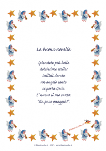 Da Filastrocche.it ecco una nuova idea da usare come decorazione o come regalo in occasione di Natale. Stampa su un cartoncino la Poesia in Cornice “La Buona Novella”, arrotolala, fermala con un cordoncino rosso o verde e regalala come simpatico ricordo della Festa più bella dell’anno; oppure appendila ai muri o alle porte per decorare la tua casa, o ancora usala per abbellire la tua tavola nei giorni di festa. Tanti Auguri di Buon Natale!