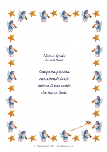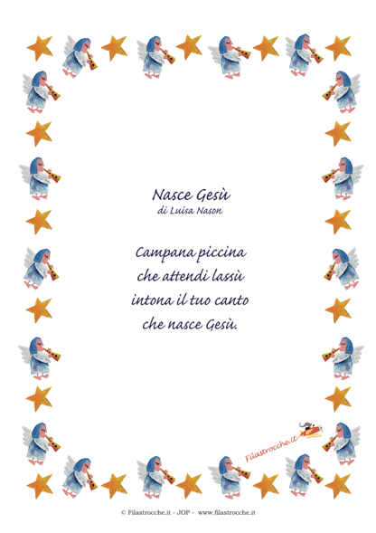 Da Filastrocche.it ecco una nuova idea da usare come decorazione o come regalo in occasione di Natale. Stampa su un cartoncino la Poesia in Cornice “Nasce Gesù di Luisa Nason”, arrotolala, fermala con un cordoncino rosso o verde e regalala come simpatico ricordo della Festa più bella dell’anno; oppure appendila ai muri o alle porte per decorare la tua casa, o ancora usala per abbellire la tua tavola nei giorni di festa. Tanti Auguri di Buon Natale!