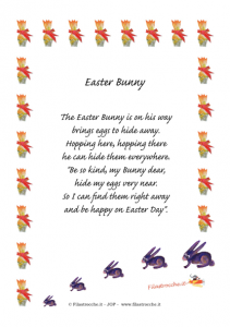 Vuoi fare un regalo carino nel giorno di Pasqua? Regala l’originalissima Poesia in Cornice di Filastrocche.it, con la poesia “Easter Bunny”. Stampala su un cartoncino, arrotolala, fermala con un nastrino colorato e consegnala come regalino pasquale, vedrai che successo! Auguri di Buona Pasqua!