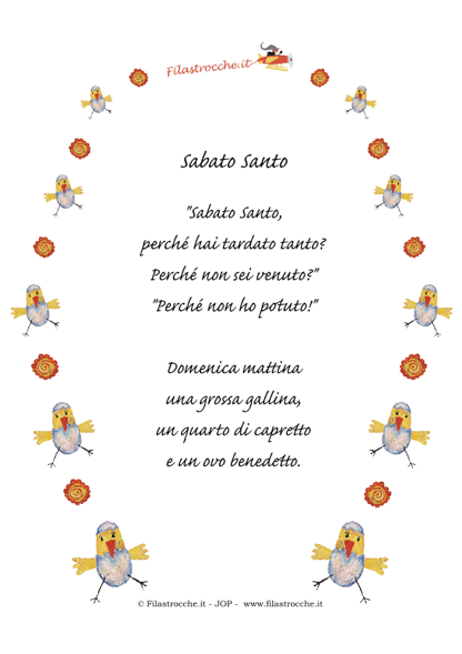 Vuoi fare un regalo carino nel giorno di Pasqua? Regala l’originalissima Poesia in Cornice di Filastrocche.it, con la poesia “Sabato Santo”. Stampala su un cartoncino, arrotolala, fermala con un nastrino colorato e consegnala come regalino pasquale, vedrai che successo! Auguri di Buona Pasqua!