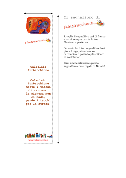 Per avere sempre con te la tua filastrocca preferita, ecco il segnalibro di Filastrocche.it “Calzolaio Furbacchione”, da tenere tra le pagine del libro che stai leggendo. Sarà un segnalibro unico, che potrai utilizzare anche come regalo di Natale