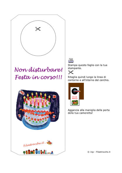 Da Filastrocche.it ecco il segnaporta “Non Disturbare! Festa in corso!” con la torta, da appendere alla vostra porta