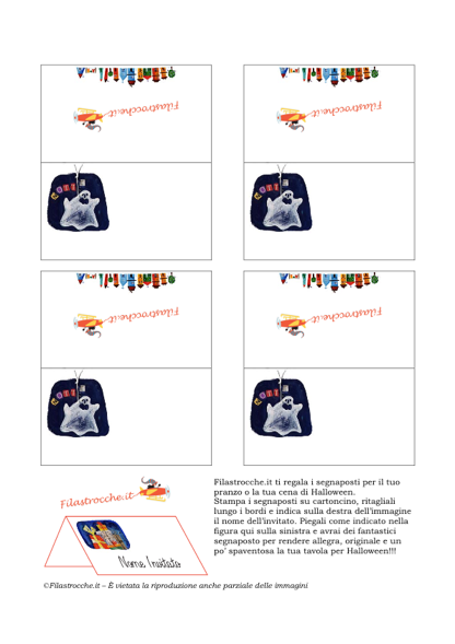 Filastrocche.it ti regala i segnaposti per il tuo pranzo o la tua cena di Halloween. Stampa i segnaposti su cartoncino, ritagliali lungo i bordi e indica sulla destra dell’immagine il nome dell’invitato. Piegali e avrai dei fantastici segnaposto per rendere allegra, originale e un po’ spaventosa la tua tavola per Halloween!!!