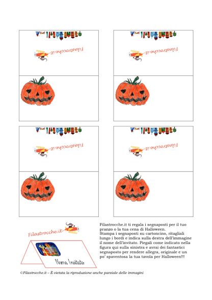Filastrocche.it ti regala i segnaposti per il tuo pranzo o la tua cena di Halloween. Stampa i segnaposti su cartoncino, ritagliali lungo i bordi e indica sulla destra dell’immagine il nome dell’invitato. Piegali e avrai dei fantastici segnaposto per rendere allegra, originale e un po’ spaventosa la tua tavola per Halloween!!!