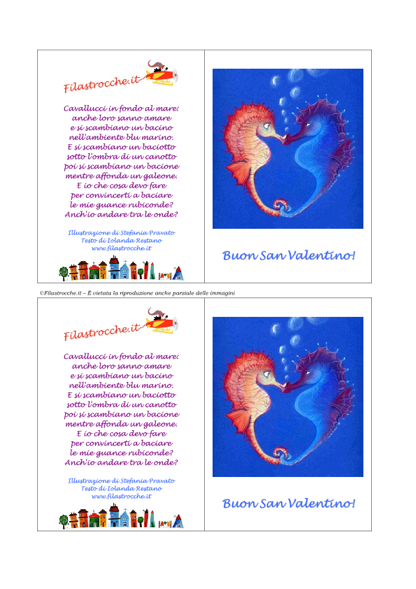 Da Filastrocche.it ecco il biglietto di auguri con i cavallucci marini, illustrato da Stefania Pravato. Per la Festa di San Valentino regala a chi ti vuole bene questo originale e simpatico biglietto. Tanti auguri di San Valentino!