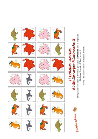 Da Filastrocche.it e Giuliana Donati ecco un Domino ispirato agli animali del mare, per trascorrere in allegria le giornate di vacanza. Stampate le immagini, ritagliate le tessere e iniziate a giocare! Regole del gioco: possono partecipare da 2 a 4 giocatori. Disponete le tessere su un tavolo con l’immagine capovolta. Ogni giocatore pesca 6 tessere, le altre restano coperte sul tavolo. Inizia a giocare chi ha in mano la tessera con due facce uguali del valore più alto. I valori sono i seguenti: Cavalluccio Marino: 6, Granchio: 5, Tartaruga: 4, Polipetto: 3, Pesce: 2, Stella Marina: 1, Squalo: 0. Il giocatore che ha in mano la tessera doppia del valore maggiore, la pone in mezzo al tavolo; a turno, gli altri giocatori disporranno le proprie tessere , con un’immagine uguale, vicino ad una delle due estremità della fila già presente sul tavolo. Se non possiede una carta uguale, che possa essere attaccata alla “coda”, deve pescare una nuova tesserina fra quelle già presenti sul tavolo. Dovrà continuare a pescare finché non troverà una tesserina adatta ad essere attaccata alla coda. Il gioco continua finché restano sul tavolo due tessere coperte. I giocatori si passeranno il turno finché non saranno messe sul tavolo tutte le tessere possibili. Vince la partita chi resterà con il minor numero di carte in mano