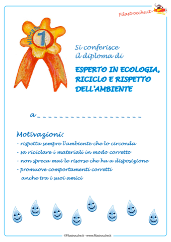 Ecco il Diploma di Esperto in Ecologia, Riciclo e Rispetto dell’Ambiente, da consegnare a chi si è distinto sui temi ambientali. Per fare un regalo simpatico e originale, stampa il diploma di Filastrocche.it, firmalo, arrotolalo e decoralo con un nastrino colorato. E’ pronto per essere consegnato all’Esperto in Ecologia!