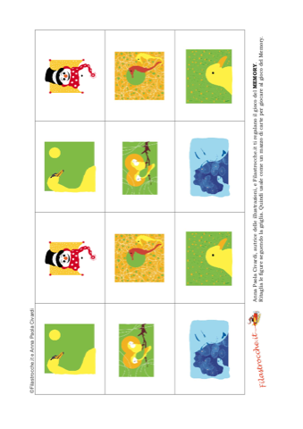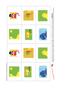 Da Filastrocche.it ecco un divertente Memory da realizzare con le vostre mani, con le bellissime illustrazioni di Anna Paola Civardi. Stampate due volte le immagini su un cartoncino, ritagliate le tesserine e disponetele su una tavolo con l’immagine rivolta verso il basso. A turno ogni giocatore girerà due tessere per volta, che tutti vedranno, cercando di trovare due figure uguali fra loro. Chi trova le coppie, prende le carte e gioca di nuovo; chi sbaglia, rigira le carte scoperte e passa il turno al giocatore successivo. Vince chi ha totalizzato il maggior numero di coppie. Buon divertimento!