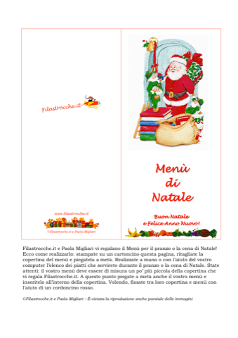 Per il pranzo o la cena di Natale con amici e parenti, ecco il menù di Filastrocche.it con la splendida illustrazione di Paola Migliari. Stampatelo su un cartoncino, ritagliatelo e decoratelo con un nastrino colorato. La vostra tavola sarà bella e raffinata! Tanti auguri di Buon Natale!