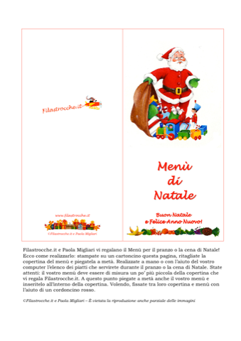 Per il pranzo o la cena di Natale con amici e parenti, ecco il menù di Filastrocche.it con la splendida illustrazione di Paola Migliari. Stampatelo su un cartoncino, ritagliatelo e decoratelo con un nastrino colorato. La vostra tavola sarà bella e raffinata! Tanti auguri di Buon Natale!