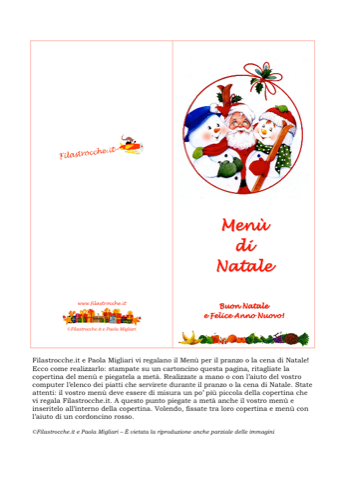 Per il pranzo o la cena di Natale con amici e parenti, ecco il menù di Filastrocche.it con la splendida illustrazione di Paola Migliari. Stampatelo su un cartoncino, ritagliatelo e decoratelo con un nastrino colorato. La vostra tavola sarà bella e raffinata! Tanti auguri di Buon Natale!
