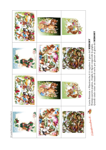 Da Filastrocche.it ecco un divertente Memory con le bellissime illustrazioni di Lucia Simonis. Realizzatelo insieme ai vostri amici: stampate due volte le immagini su un cartoncino, ritagliate le tesserine e disponetele su una tavolo con l’immagine rivolta verso il basso. A turno ogni giocatore girerà due tessere per volta, che tutti vedranno, cercando di trovare due figure uguali fra loro. Chi trova le coppie, prende le carte e gioca di nuovo; chi sbaglia, rigira le carte scoperte e passa il turno al giocatore successivo. Vince chi ha totalizzato il maggior numero di coppie