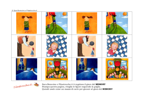 Da Filastrocche.it ecco un divertente Memory con le bellissime illustrazioni di Sara Benecino. Realizzatelo insieme ai vostri amici: stampate due volte le immagini su un cartoncino, ritagliate le tesserine e disponetele su una tavolo con l’immagine rivolta verso il basso. A turno ogni giocatore girerà due tessere per volta, che tutti vedranno, cercando di trovare due figure uguali fra loro. Chi trova le coppie, prende le carte e gioca di nuovo; chi sbaglia, rigira le carte scoperte e passa il turno al giocatore successivo. Vince chi ha totalizzato il maggior numero di coppie