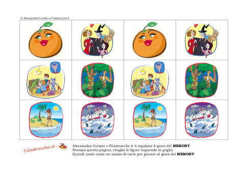 Da Filastrocche.it ecco un divertente Memory con le bellissime illustrazioni di Alessandra Ceriani. Realizzatelo insieme ai vostri amici: stampate due volte le immagini su un cartoncino, ritagliate le tesserine e disponetele su una tavolo con l’immagine rivolta verso il basso. A turno ogni giocatore girerà due tessere per volta, che tutti vedranno, cercando di trovare due figure uguali fra loro. Chi trova le coppie, prende le carte e gioca di nuovo; chi sbaglia, rigira le carte scoperte e passa il turno al giocatore successivo. Vince chi ha totalizzato il maggior numero di coppie